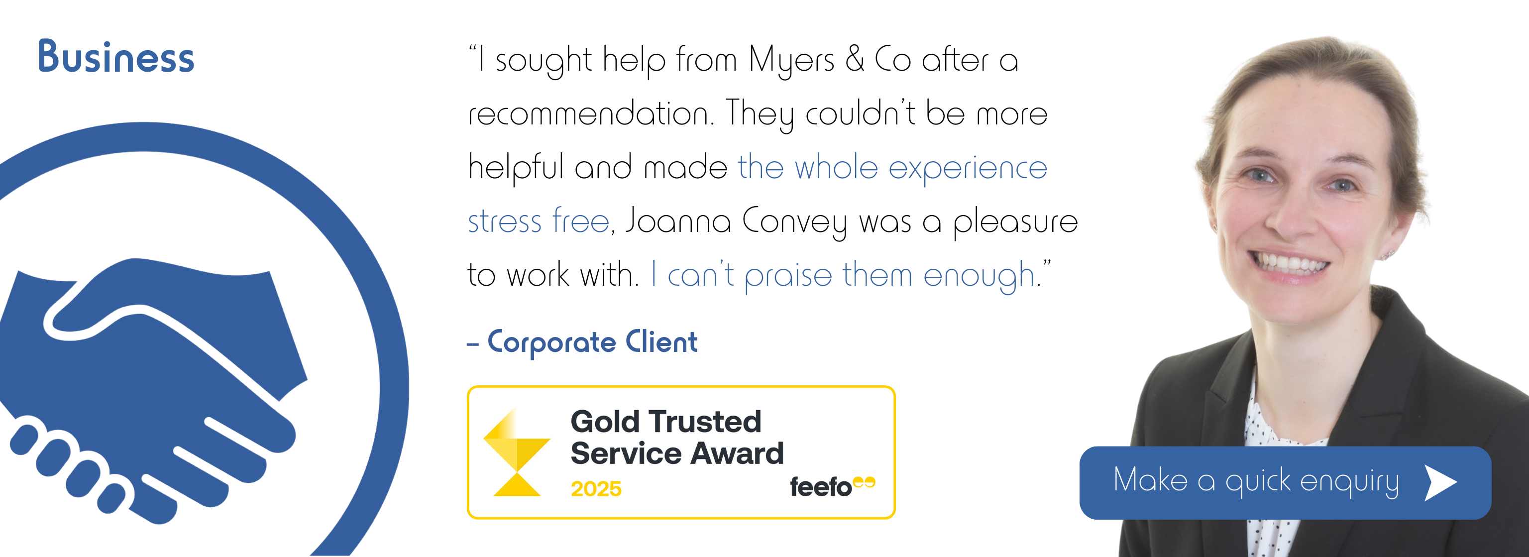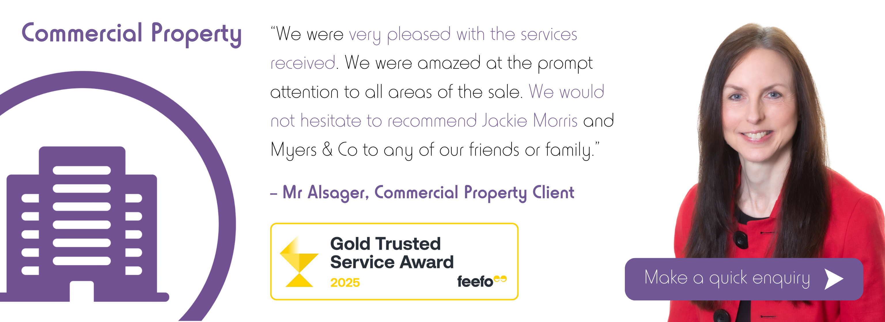 I have used Myers & Co for property transactions since 2013 and so I know the quality of service I can expect. Julie Brammer has looked after me well all these years. - Mr W